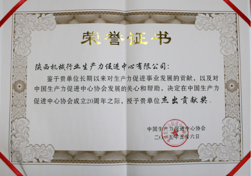 2015年5月7日,中國(guó)生產(chǎn)力促進(jìn)中心協(xié)會(huì)20周年暨中國(guó)生產(chǎn)力創(chuàng)新創(chuàng)業(yè)發(fā)展論壇在北京隆重開幕,陜西機(jī)械行業(yè)生產(chǎn)力促進(jìn)中心(有限公司)榮獲“杰出貢獻(xiàn)獎(jiǎng)”先進(jìn)集體光榮稱號(hào)。